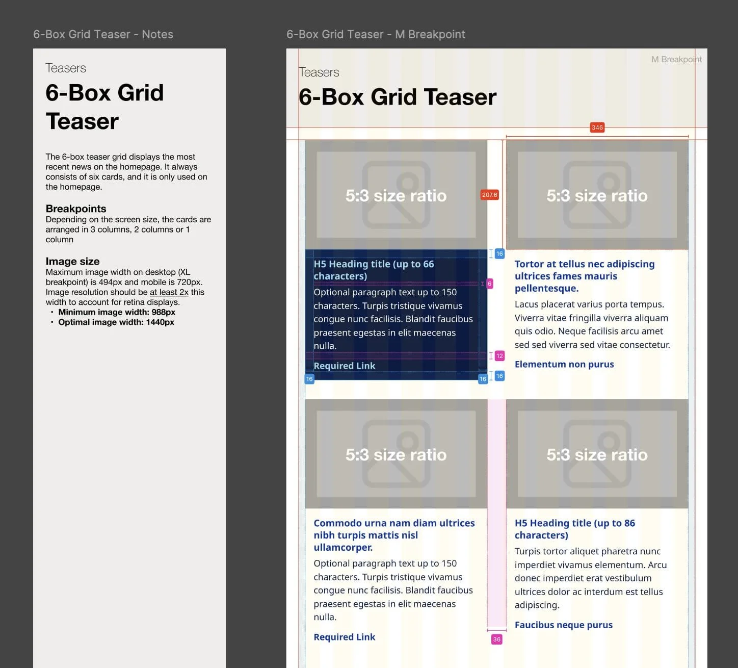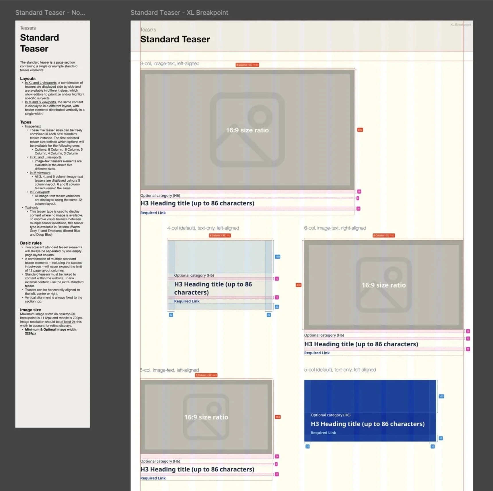 A hierarchical teaser system was designed to help regional marketing teams surface and prioritize content more effectively. Multi-column desktop layouts—spanning 8, 6, and 5 columns—were developed to reflow cleanly on smaller screens, keeping content easy to scan across devices.