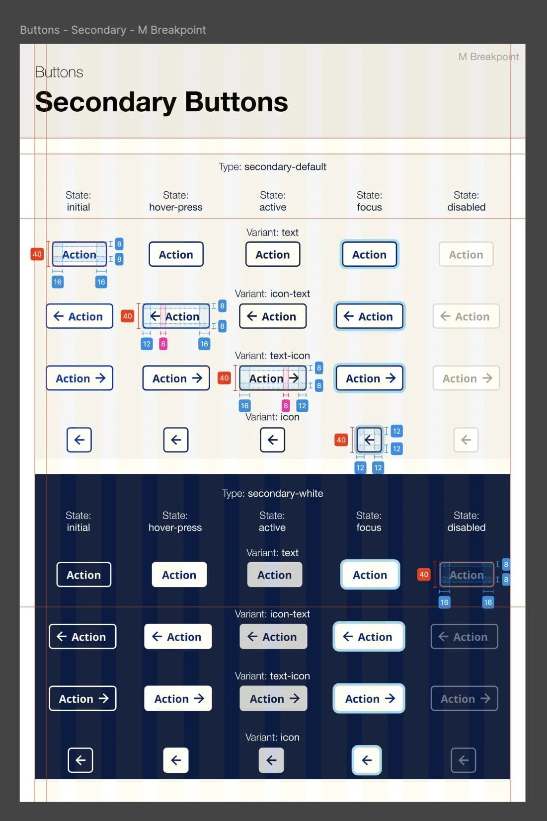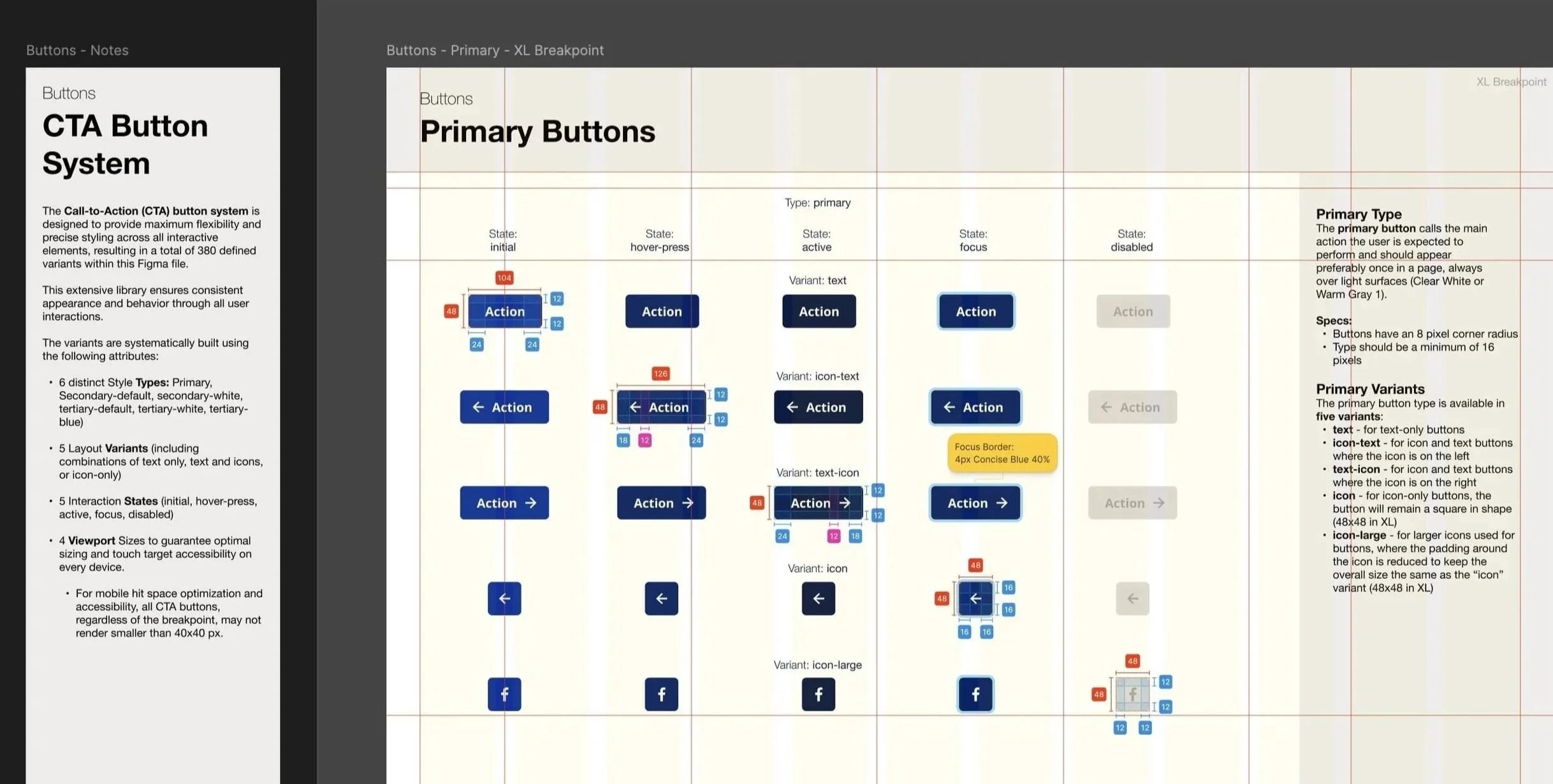 The UI library expanded to include more than 380 button variants, covering interaction states such as default, hover, focus, and disabled. A 40x40px minimum touch target was implemented across all mobile breakpoints to support WCAG 2.1 compliance and enhance usability for all users.