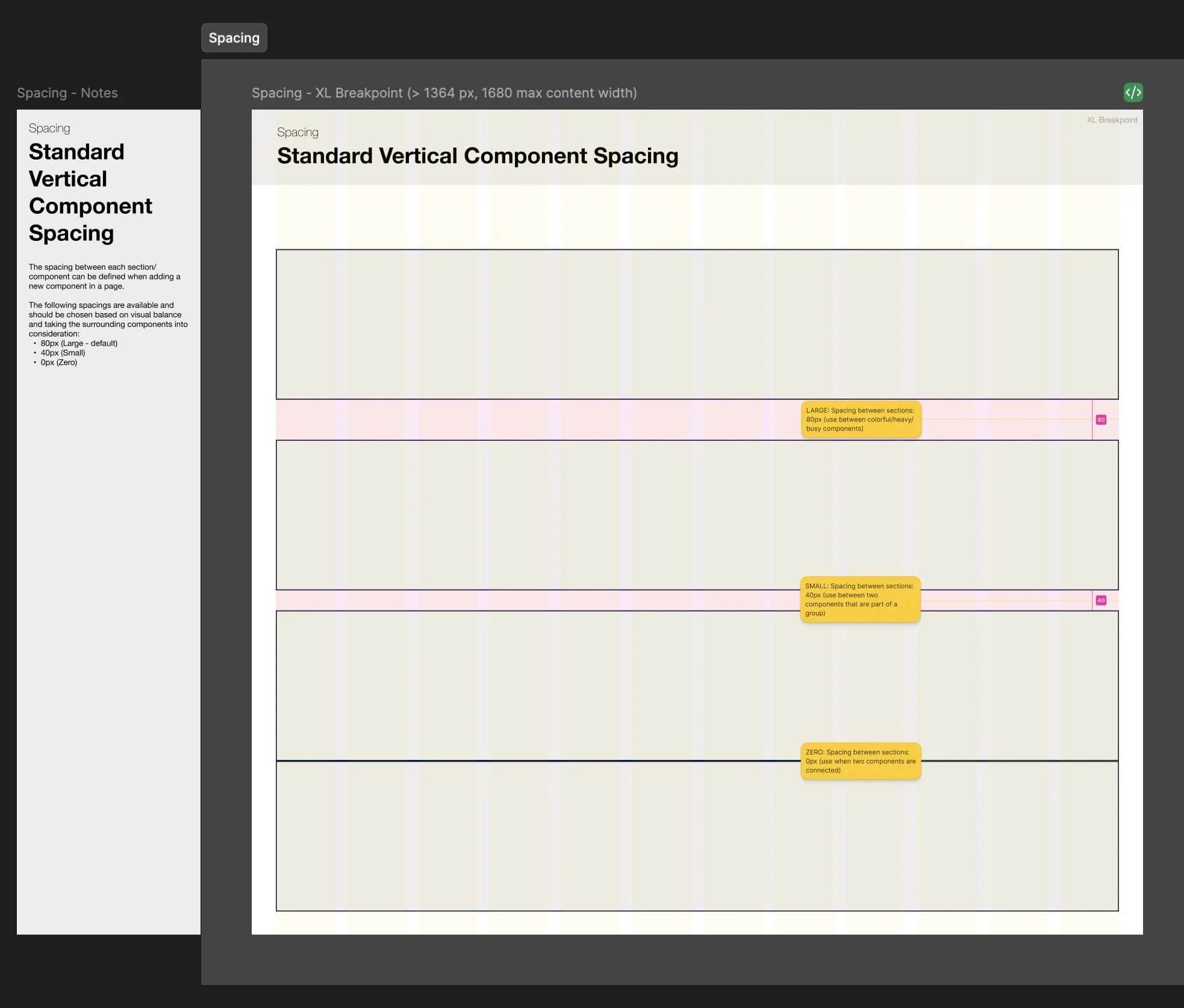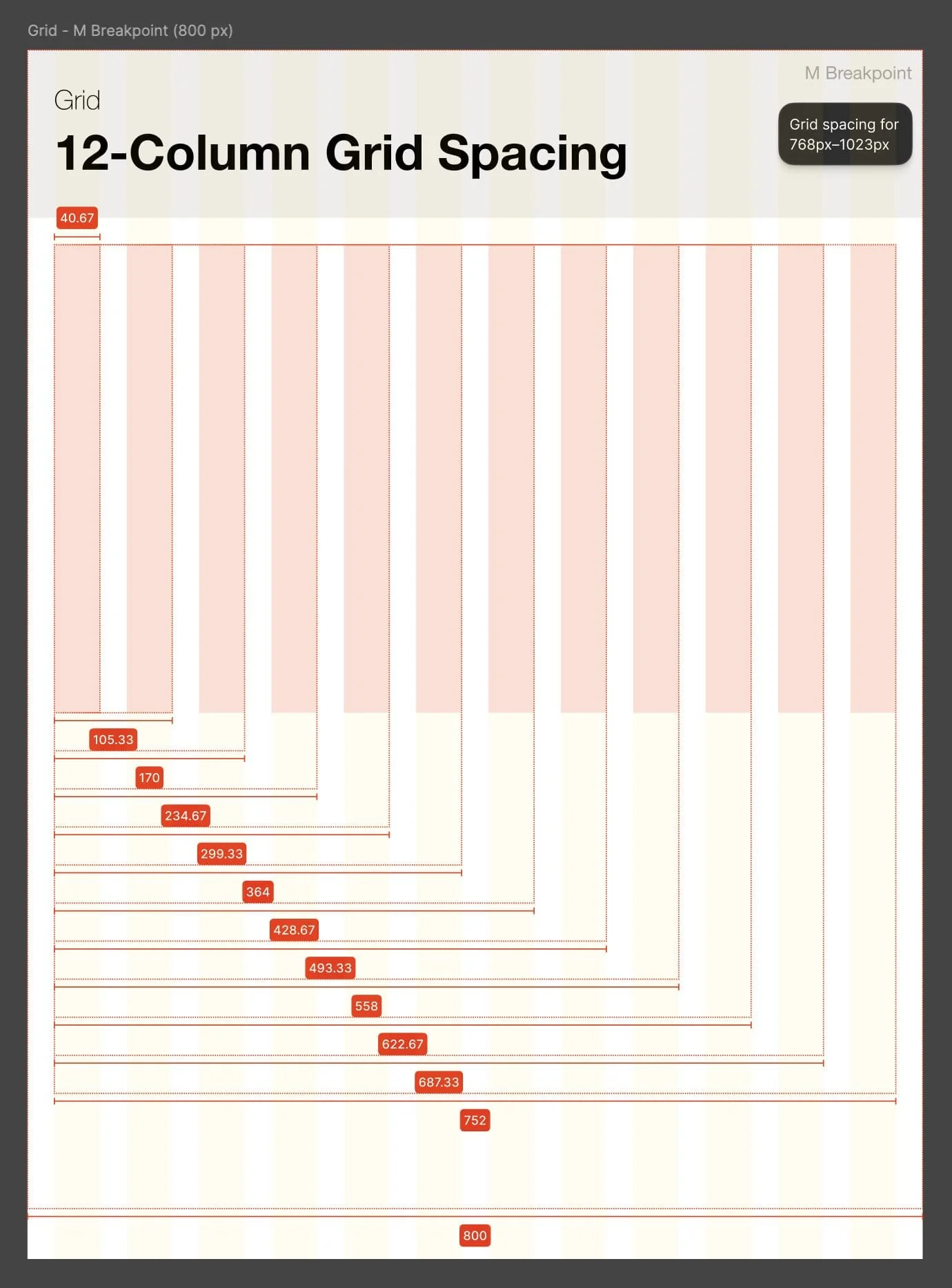 A 12-column grid system was developed to serve as the structural foundation for all page layouts. From a 1680px desktop maximum down to single-column mobile views, consistent subgrid and margin rules help ensure predictable, clean content reflow across breakpoints.