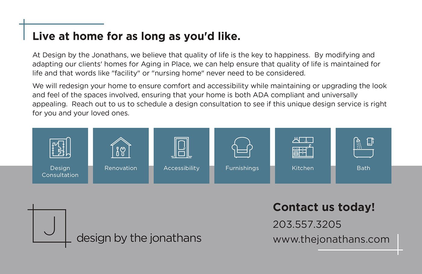 I created a comprehensive services brochure and specialty cards for Design by the Jonathans, highlighting their four core specialties: kitchens, bathrooms, interiors, and “aging in place”. The trifold brochure includes: